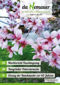 Auf einen Blick Veranstaltungen bis zur nächsten Ausgabe von „da Hemauer“ (Quelle: www.hemau.de, www.heimat-info.de) Montag, 16. März 2026 19:00 Uhr Dienstag, 17. März 2026 19:00 Uhr Donnerstag, 19. März 2026 18:45 Uhr Sitzung des Stadtrates Ratssaal/Zehentstadel Sitzung des Bau- und Umweltausschusses Ratssaal/Zehentstadel Für die Vollständigkeit und Richtigkeit der genannten Termine wird keine Gewähr übernommen. Informationsveranstaltung „Coworking-Space in der Grunwald-Villa“ Grunwald-Anwesen, Riedenburger Str. 34, Hemau Palmbüschelbinden für Mitglieder und Nicht-Mitglieder des Gartenbauvereins Neukirchen, Pfarrheim Neukirchen. Bitte Schere und Drahtzange mitbringen! Jahreshauptversammlung Tangrintler Josefsverein Vereinslokal Mirbeth, Tiefenhüll Treffpunkt vor der Pfarrkirche Neukirchen zum Gottesdienst, anschließend Jahreshauptversammlung Jahreshauptversammlung Jagdgenossenschaft Langenkreith Landgasthof Ferstl-Bruckmeier, Hemau Theater in Schama – „Es fährt kein Zug nach (N)irgendwo“ Veitl-Saal, Hohenschambach Weitere Aufführungen: 21./22./27./28./29. März, Beginn Freitag u. Samstag um 19:30 Uhr, Sonntag um 18:30 Uhr. Familien- und Seniorenvorstellung am 28. März um 14 Uhr Jahreshauptversammlung Jägerverein Schwarze Laber/Tangrintl e. V. Tangrintler Hof, Tiefenhüll Jahreshauptversammlung der FF Klingen Gasthaus Dinauer, Klingen (Kirche vorher um 19:00 Uhr) Kasperltheater Rundes Haus, Hemau Generalversammlung FF Hohenschambach Gasthof „Zur Post“, Hohenschambach Osterbasteln für Kinder Stadtbibliothek Hemau Jahreshauptversammlung Jagdgenossenschaft Thonlohe Gasthaus Graf, Thonlohe Jahreshauptversammlung OGV Hohenschambach Gasthof „Zur Post“, Hohenschambach Kindertheater „Du bist einmalig“ Zehentstadel Hemau Weitere Aufführung: 28. März 2026, 18:00 Uhr Jagdgenossenschaftsversammlung der Jagdgenossenschaft Hemau Landgasthof Ferstl-Bruckmeier, Hemau Tangrintel Repair Café Riedenburger Str. 34, Hemau Frühlingskonzert Stadtkapelle Hemau Tangrintelhalle Hemau TV Hemau Tanzevent Tangrintelhalle Hemau Krimi-Lesung mit Richard Auer und dem Gitarrenduo „Saitenwexl“ Stadtbibliothek Hemau Lions Club Benefiz-Schafkopfturnier Tangrintelhalle Hemau (Einlass ab 18:00 Uhr) Buchlesung mit Musikkabarett „Von Bleiben war nie die Rede“ von und mit Karin Simon Rundes Haus, Hemau. Kartenvorverkauf in der Buchhandlung am Alten Rathaus Jagdversammlung der Jagdgenossenschaft Aichkirchen Gasthaus Meyer, Aichkirchen Kinderbekleidungs- und Spielzeugbasar Eltern-Kind-Gruppen Hemau, Tangrintelhalle Hemau Infoveranstaltung Sturzflut- und Hochwasserrisikomanagement für Hemau und Hohenschambach Landgasthof Ferstl-Bruckmeier, Hemau Jahreshauptversammlung Stadtkapelle Hemau Proberaum (2. Stock) im Haus der Musik, Hemau Benefizspieltag der HG Hemau-Beratzhausen Tangrintelhalle Hemau Kasperltheater Rundes Haus, Hemau Donnerstag, 19. März 2026 19:30 Uhr Freitag, 20. März 2026 19:30 Uhr Samstag, 21. März 2026 19:30 Uhr Samstag, 21. März 2026 20:00 Uhr Sonntag, 22. März 2026 14 Uhr Sonntag, 22. März 2026 19:00 Uhr Mittwoch, 25. März 2026 15:00–18:00 Uhr Mittwoch, 25. März 2026 19:30 Uhr Donnerstag, 26. März 2026 19:00 Uhr Freitag, 27. März 2026 18:00 Uhr Freitag, 27. März 2026 19:30 Uhr Samstag, 28. März 2026 09:00–12:00 Uhr Samstag, 28. März 2026 19:30 Uhr Sonntag, 29. März 2026 14:30 Uhr Sonntag, 29. März 2026 17 Uhr Freitag, 10. April 2026 19:00 Uhr Freitag, 10. April 2026 19:30 Uhr Samstag, 11. April 2026 19:30 Uhr Sonntag, 12. April 2026 13:30–15:30 Uhr Mittwoch, 15. April 2026 18:00 Uhr Freitag, 17. April 2026 20:30 Uhr Sonntag, 19. April 2026 13:00 Uhr Sonntag, 19. April 2026 14:00 Uhr Sitzungskalender Dienstag, 24. März 2026 19:00 Uhr Dienstag, 14. April 2026 19:00 Uhr